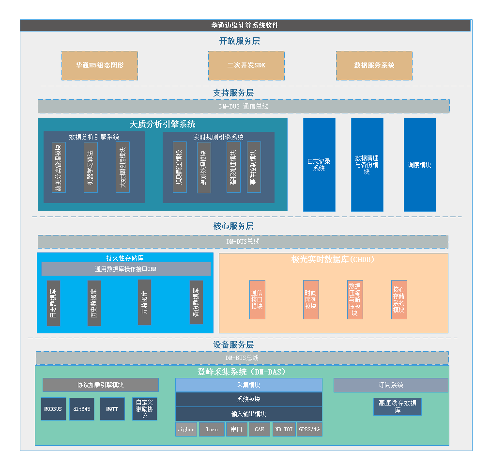 華通邊緣計系統(tǒng)信集成登峰采集系統(tǒng)、輕量級消息總線、極光實時數(shù)據(jù)庫、天質(zhì)分析引擎、華通組態(tài)軟件以便客戶快速開發(fā)和產(chǎn)品化